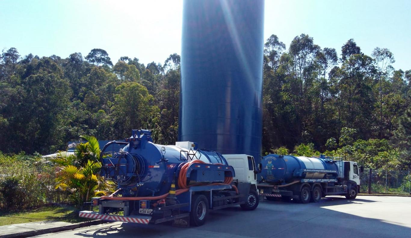 Frota própria, o caminhão combinado tem sua carroceria dividida em armazenagem de água contaminada e de água limpa para hidrojateamento.